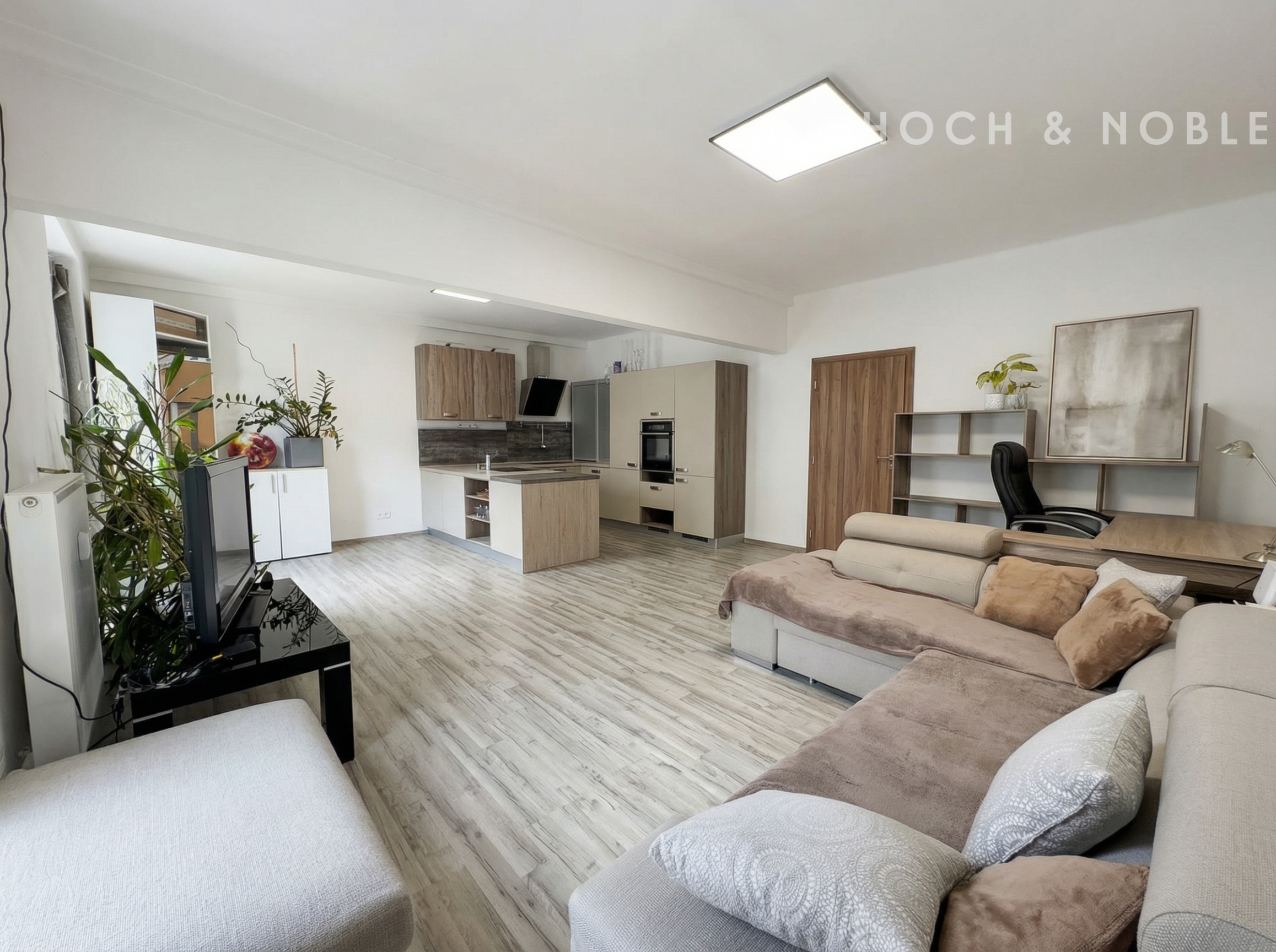 Rekonštrukciou a odstránením priečky vznikol moderný otvorený priestor, ktorý prepája obývaciu izbu s kuchyňou a vytvára príjemnú, vzdušnú dennú zónu.